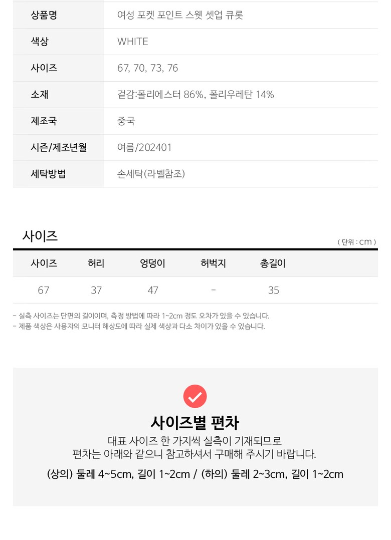 | 3. 치수 | 67사이즈실측기준 : 허리37cm, 엉덩이47cm, 총길이35cm |