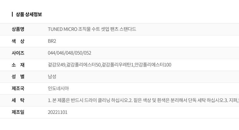 1. 제품 소재 (섬유의 조성 또는 혼용률을 백분율로 표시, 기능성인 경우 성적서 또는 허가서) 겉감모49,겉감폴리에스터50,겉감폴리우레탄1,안감폴리에스터100