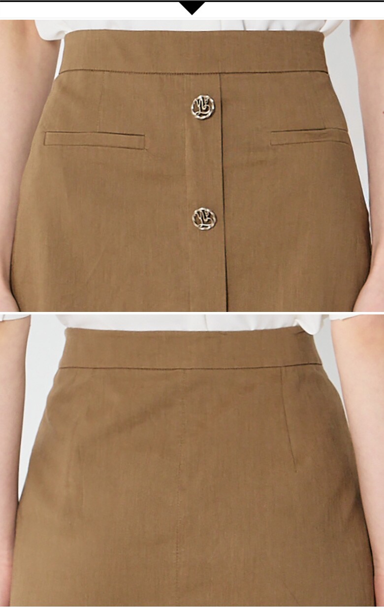 앞면의 페이크 버튼으로 포인트를 준 미디 기장의 스커트입니다.