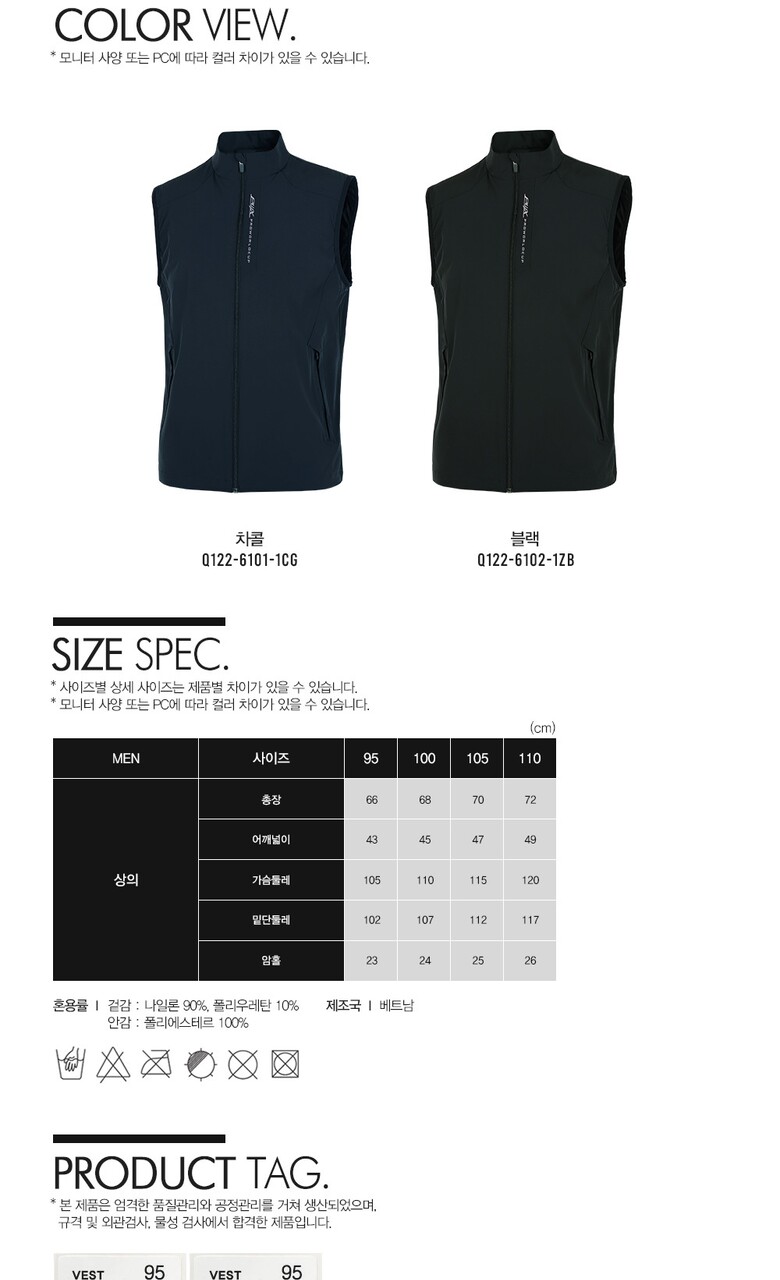 1. 제품 소재 (섬유의 조성 또는 혼용률을 백분율로 표시, 기능성인 경우 성적서 또는 허가서) 겉감 : 나일론 90%, 폴리우레탄 10% / 안 감 : 폴리에스테르 100%