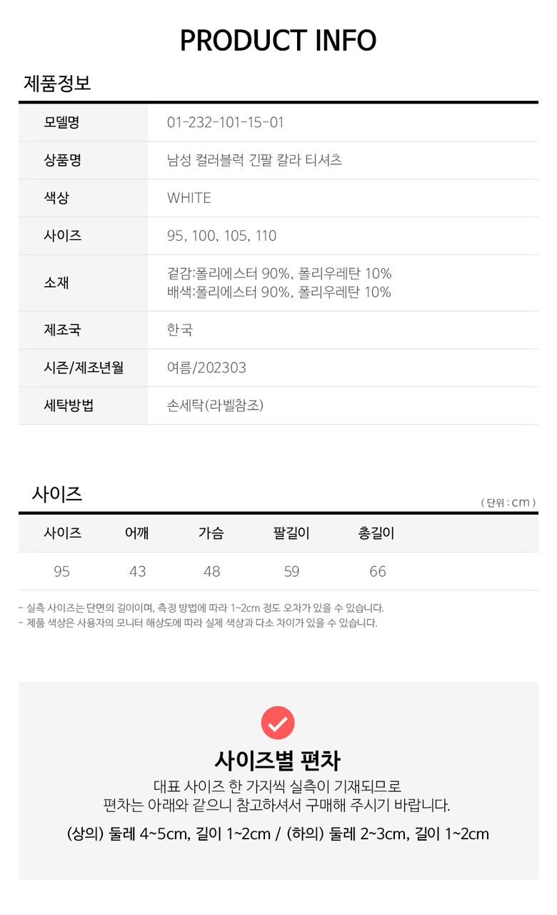 | 3. 치수 | 95사이즈기준실측 : 어깨43cm, 가슴48cm, 팔길이59cm, 총길이66cm |