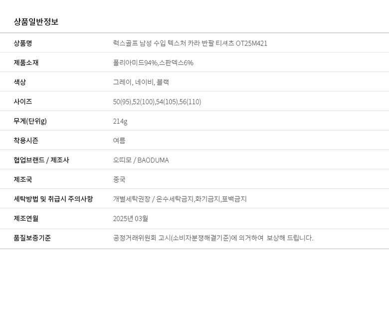 | 6. 세탁방법 및 취급시 주의사항 | 개별세탁권장/온수세탁금지,화기금지,표백금지 |