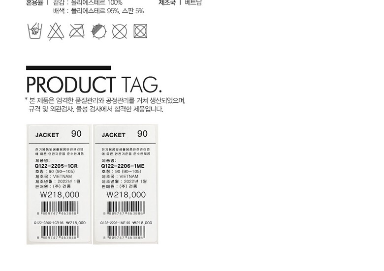 1. 제품 소재 (섬유의 조성 또는 혼용률을 백분율로 표시, 기능성인 경우 성적서 또는 허가서) | 겉감 : 폴리에스테르 100% / 배 색 : 폴리에스테르 95%, 스판 5% |