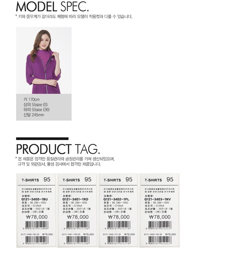 | 1. 제품 소재 (섬유의 조성 또는 혼용률을 백분율로 표시, 기능성인 경우 성적서 또는 허가서) | 상세페이지 표기 |