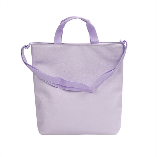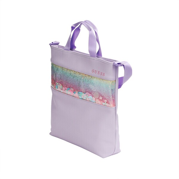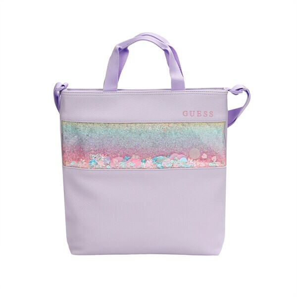 - 세련되고 산뜻한 연보라 컬러와 펄 감있는 무지개 레쟈와 떨어지는 딸랑이가 재미있는 보조가방입니다