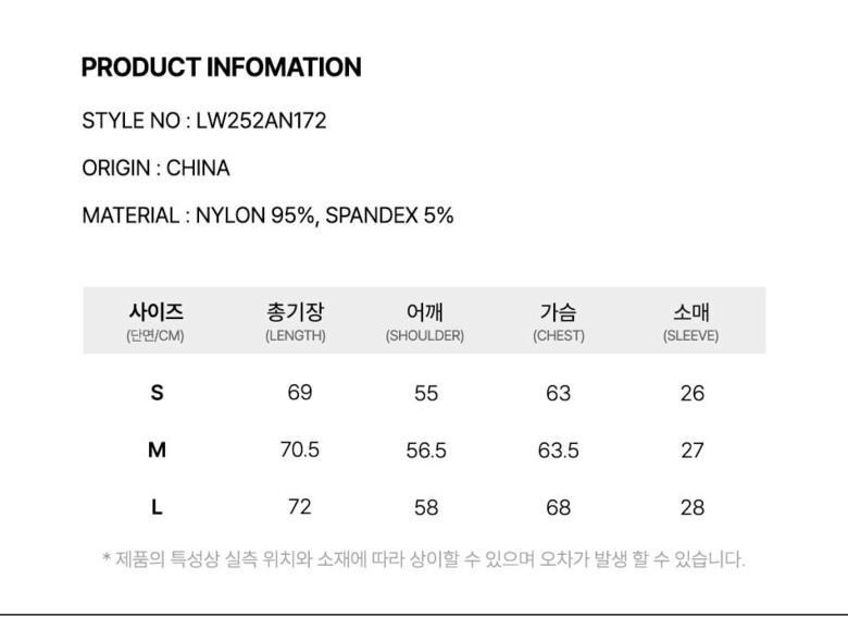 | 1. 제품 소재 (섬유의 조성 또는 혼용률을 백분율로 표시, 기능성인 경우 성적서 또는 허가서) | 겉감:나일론 95%, 폴리우레탄 5% |