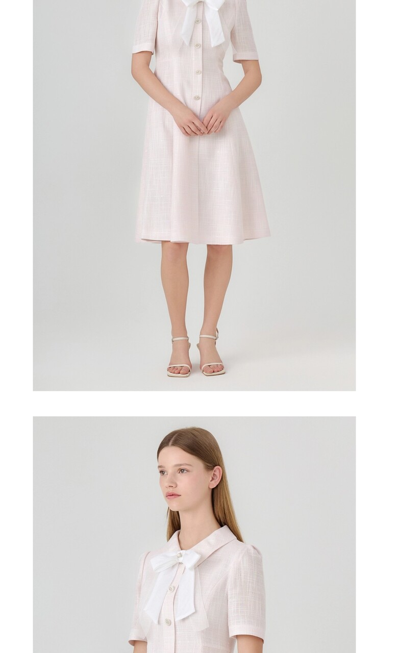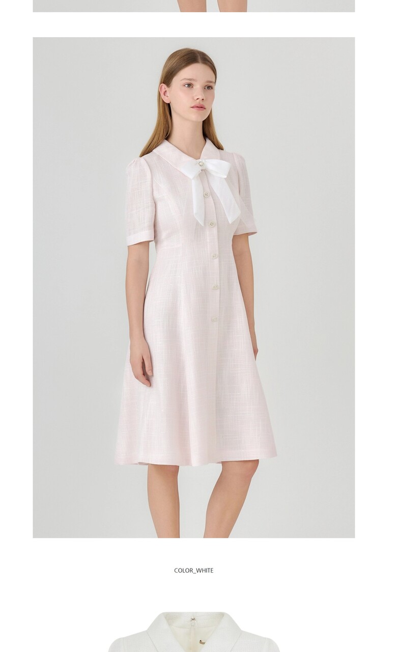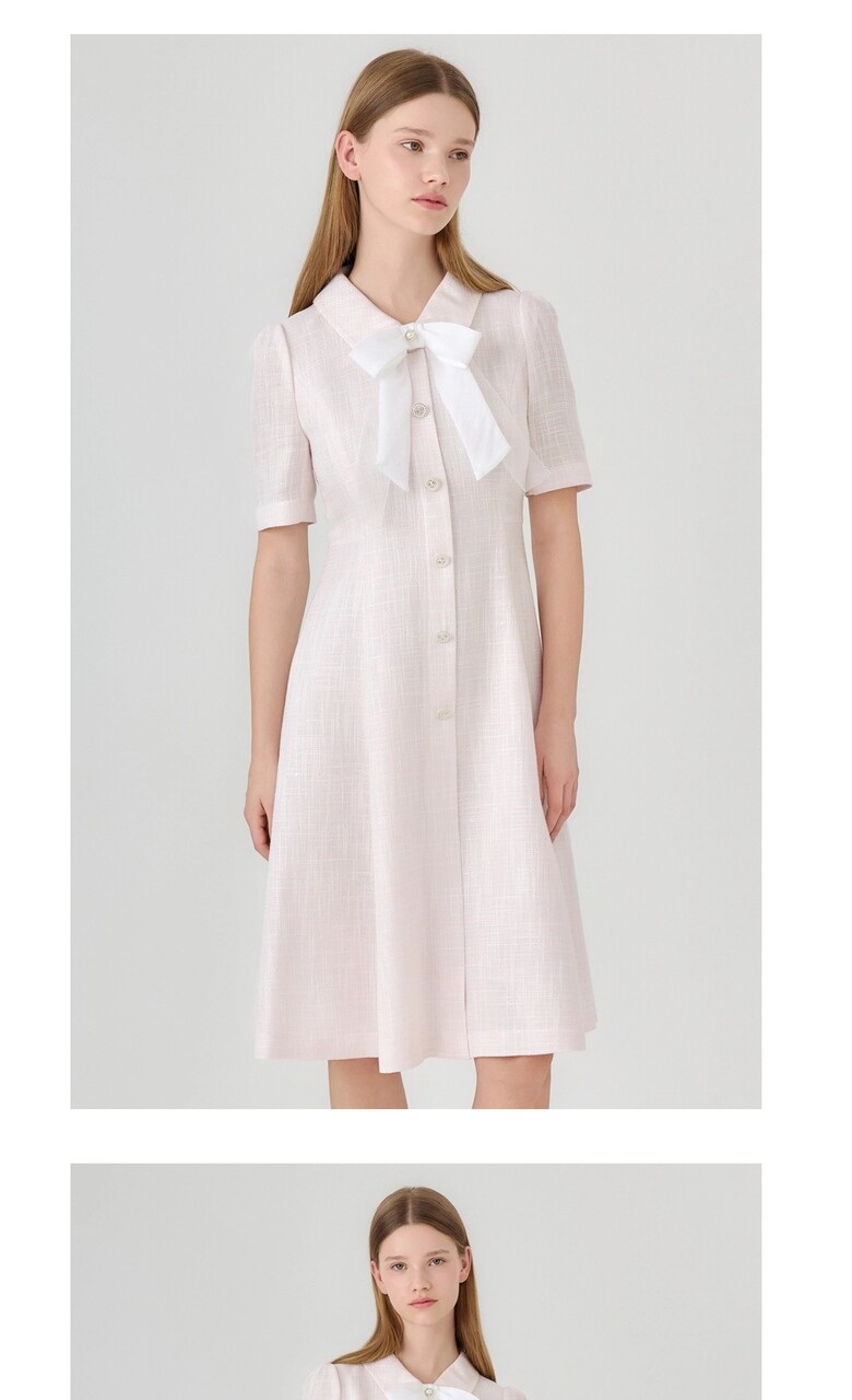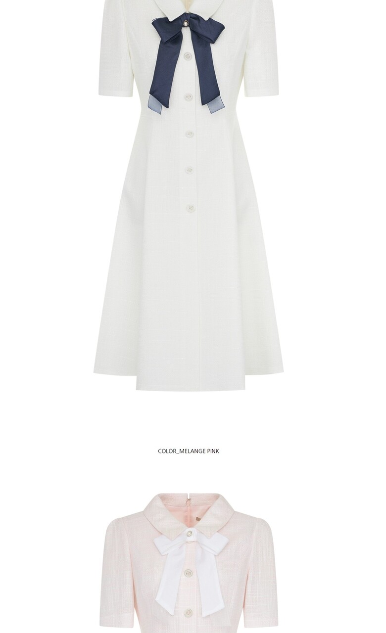 넥부분에 리본브로치로 다양한 연출이 가능한 미디 기장의 원피스입니다.