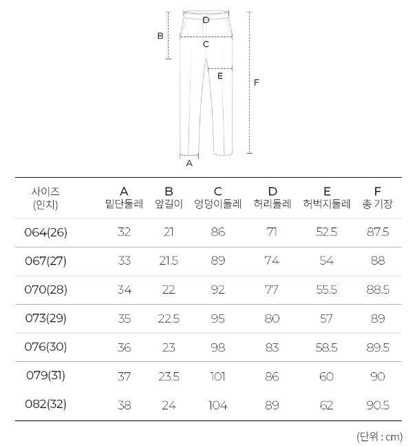 사이즈 : 64(25),67(26),70(27~28),73(28~29),76(30),79(31),82(32)