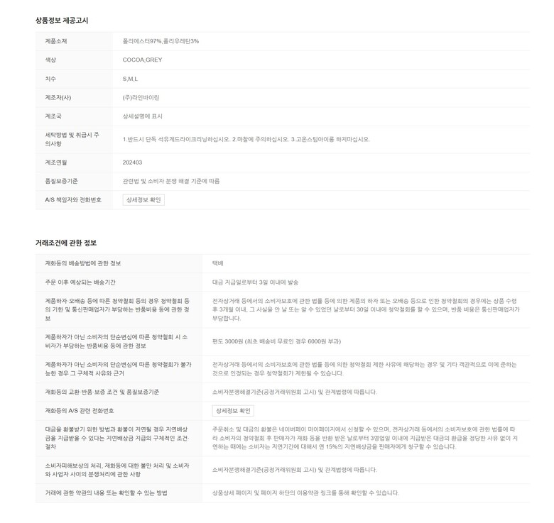 | 6. 세탁방법 및 취급시 주의사항 | 상품상세참조 |