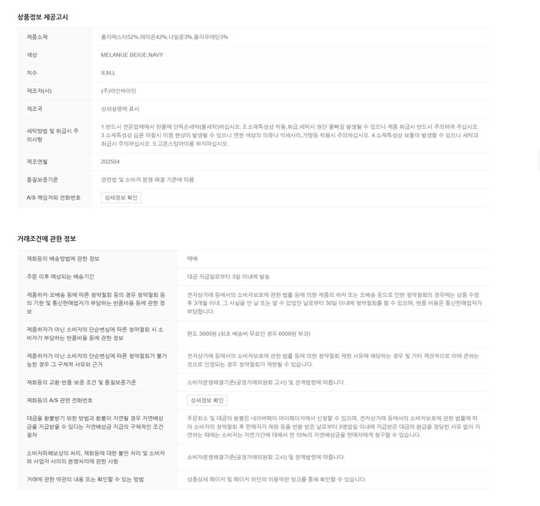| 6. 세탁방법 및 취급시 주의사항 | 상품상세참조 |