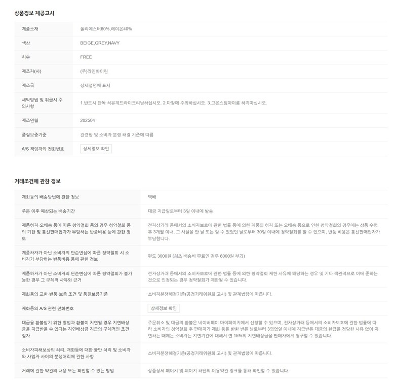 1. 제품 소재 (섬유의 조성 또는 혼용률을 백분율로 표시, 기능성인 경우 성적서 또는 허가서) | 상품상세참조 |