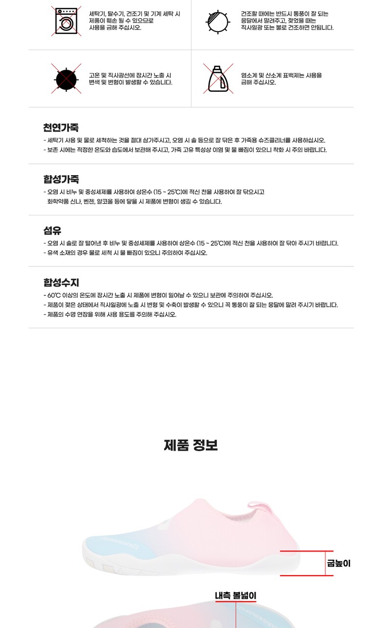 6. 취급시 주의사항 | 오염제거는 엷게 푼 세제를 부드러운 헝겊에 묻혀서 닦아주십시오. 세탁기 사용을 금합니다. 화기에 가까이하지 마세요. 오염 시 물 세척 후 통풍이 양호한 응달에서 건조 후 사용하세요. |