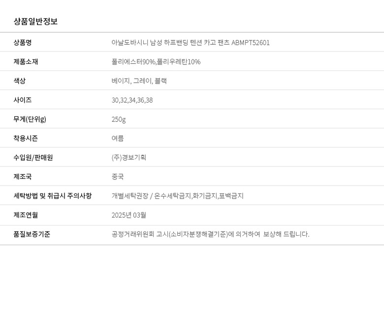 골피아 ABMPT52601 아날도바시니 남성 하프밴딩 텐션 카고 팬츠