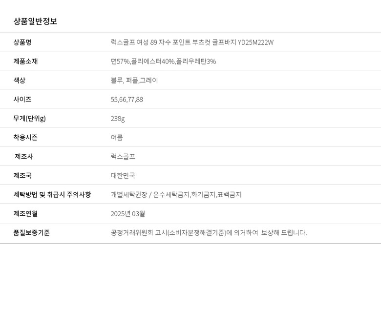 | 1. 제품 소재 (섬유의 조성 또는 혼용률을 백분율로 표시, 기능성인 경우 성적서 또는 허가서) | 상세설명참고 |