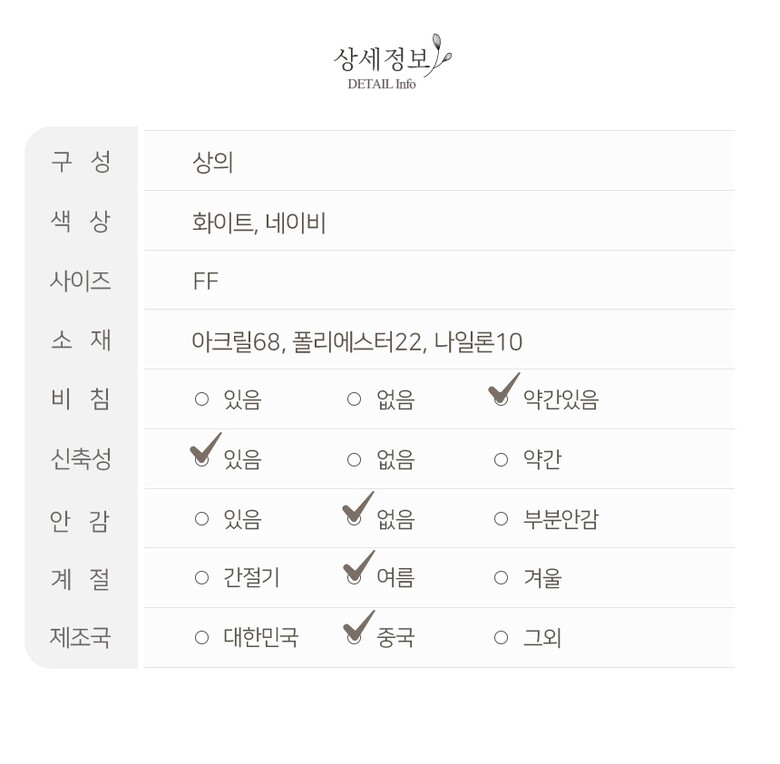 1. 제품 소재 (섬유의 조성 또는 혼용률을 백분율로 표시, 기능성인 경우 성적서 또는 허가서) | 상세페이지 참조 |