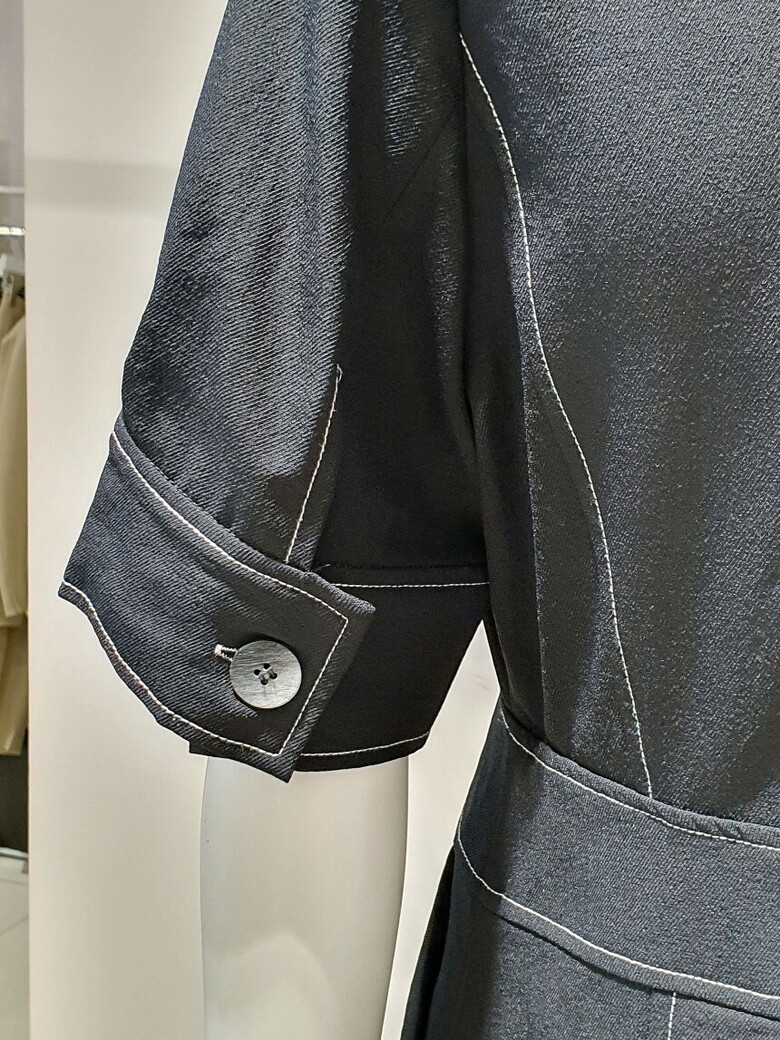 오픈칼라 라인을 따라 버튼 디테일로 포인트를 더해준