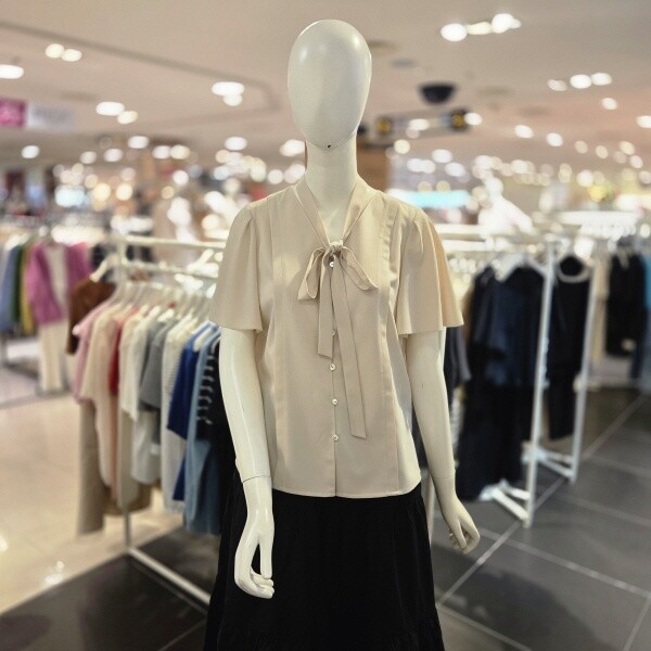브이넥 형태의 세미 정장 스타일의 블라우스로 목선 부분 끈으로 리본을 묶어 착용가능한 심플하면서 세련된 블라우스입니다.