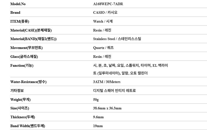 7. 주요 사양 | 레진 시계 쿼츠 |