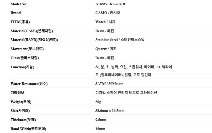 | 7. 주요 사양 | 레진 시계 쿼츠 |