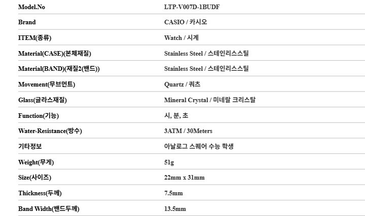 7. 주요 사양 스테인리스스틸 시계 쿼츠