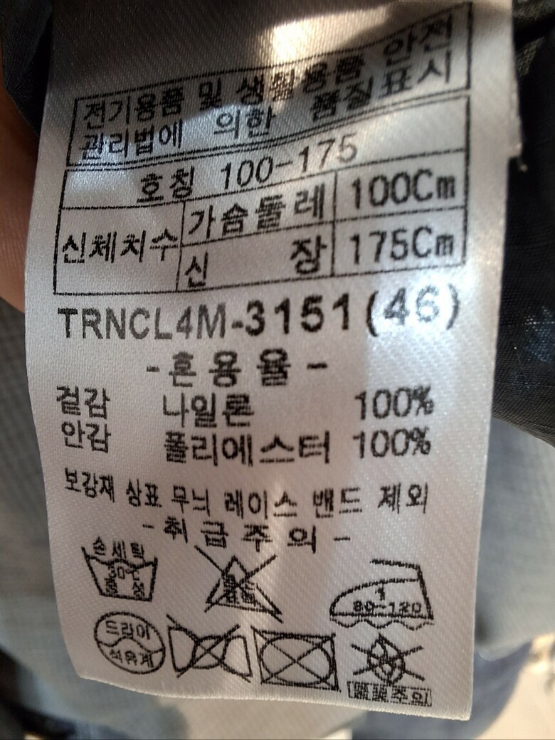| 1. 제품 소재 (섬유의 조성 또는 혼용률을 백분율로 표시, 기능성인 경우 성적서 또는 허가서) | 안감:폴리에스테르 100% / 겉감:나일론 100% |