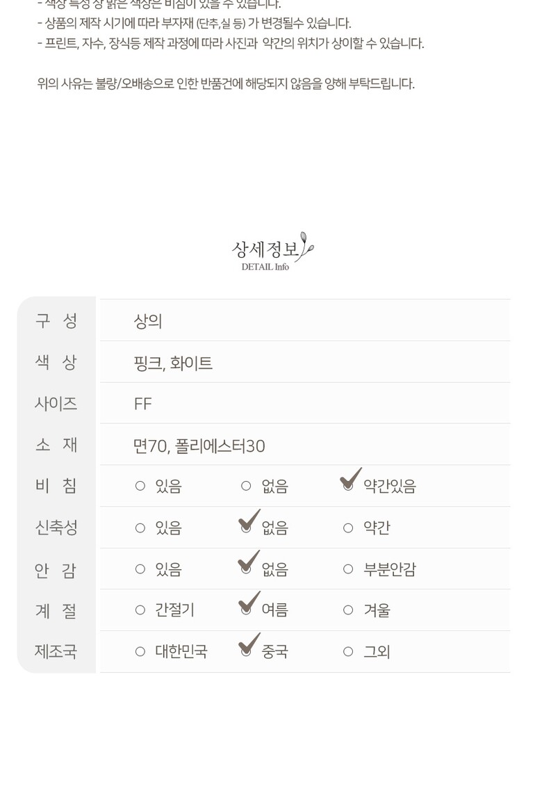 1. 제품 소재 (섬유의 조성 또는 혼용률을 백분율로 표시, 기능성인 경우 성적서 또는 허가서) | 상세페이지 참조 |