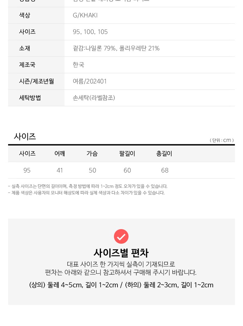 | 3. 치수 | 95사이즈실측기준 : 어깨41cm, 가슴50cm, 팔길이60cm, 총길이68cm |