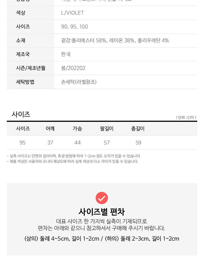 | 3. 치수 | 95사이즈기준실측 : 어깨37cm, 가슴44cm, 팔길이57cm, 총길이59cm |