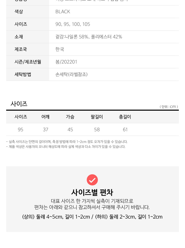 3. 치수 95사이즈기준실측 : 어깨37cm, 가슴45cm, 팔길이58cm, 총길이61cm