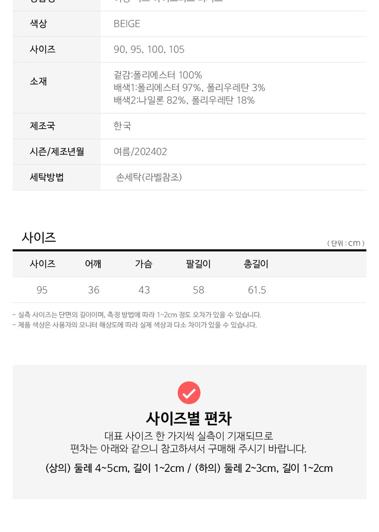 3. 치수 | 95사이즈실측기준 : 어깨36cm, 가슴43cm, 팔길이58cm, 총길이61.5cm |