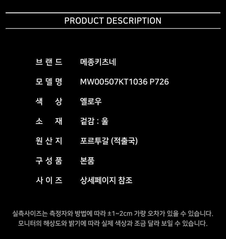 | 1. 제품 소재 (섬유의 조성 또는 혼용률을 백분율로 표시, 기능성인 경우 성적서 또는 허가서) | 상세페이지 참조 |