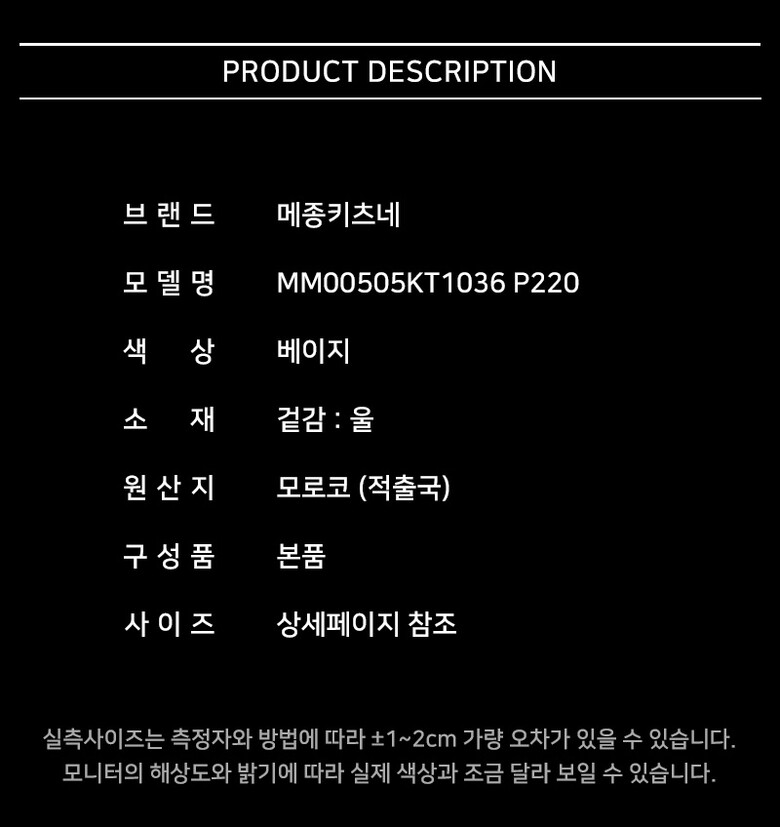 | 1. 제품 소재 (섬유의 조성 또는 혼용률을 백분율로 표시, 기능성인 경우 성적서 또는 허가서) | 상세페이지 참조 |