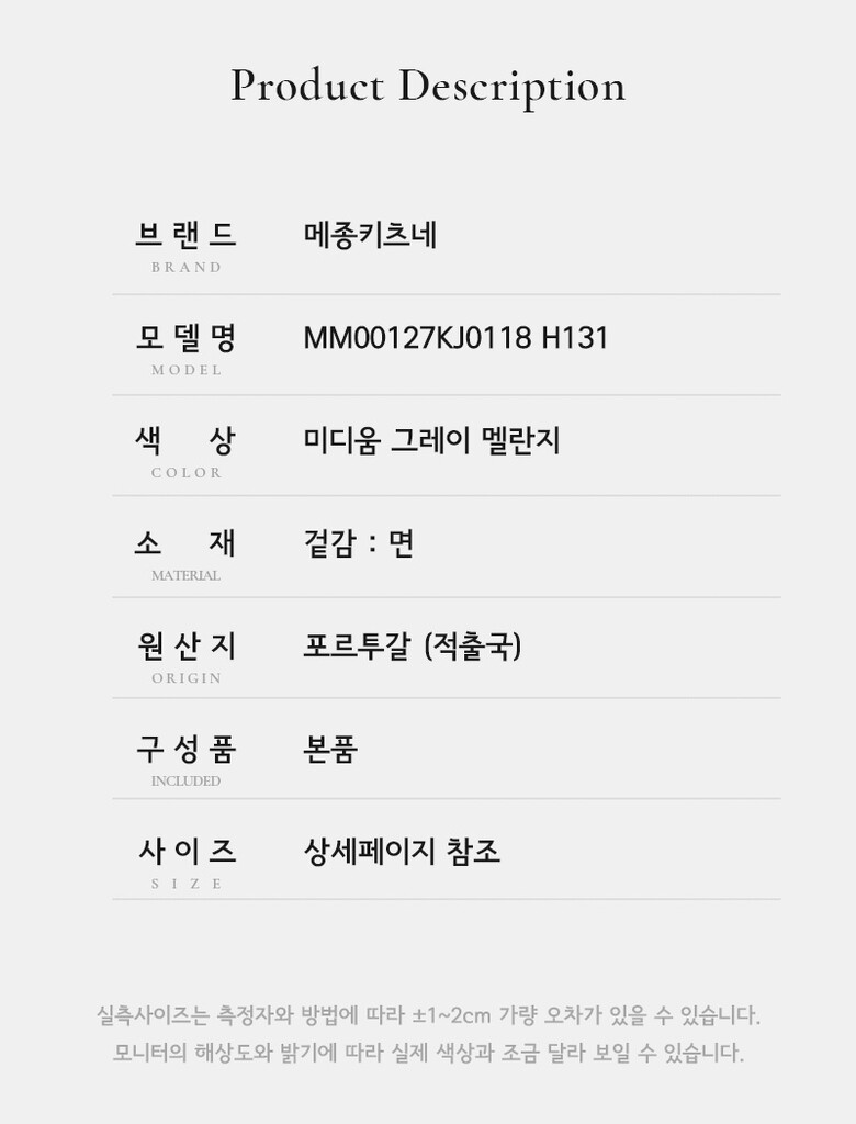 | 1. 제품 소재 (섬유의 조성 또는 혼용률을 백분율로 표시, 기능성인 경우 성적서 또는 허가서) | 상세페이지 참조 |