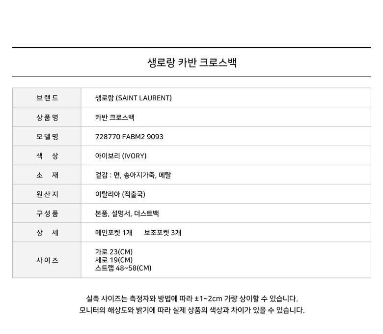 - #리본즈코리아 #728770FABM29093 #[명품] #생로랑 #르 #카반 #사첼백 #아이보리 #728770 #FABM2 #9093 #여성 #가방/핸드백 #크로스/메신저백 #크로스백