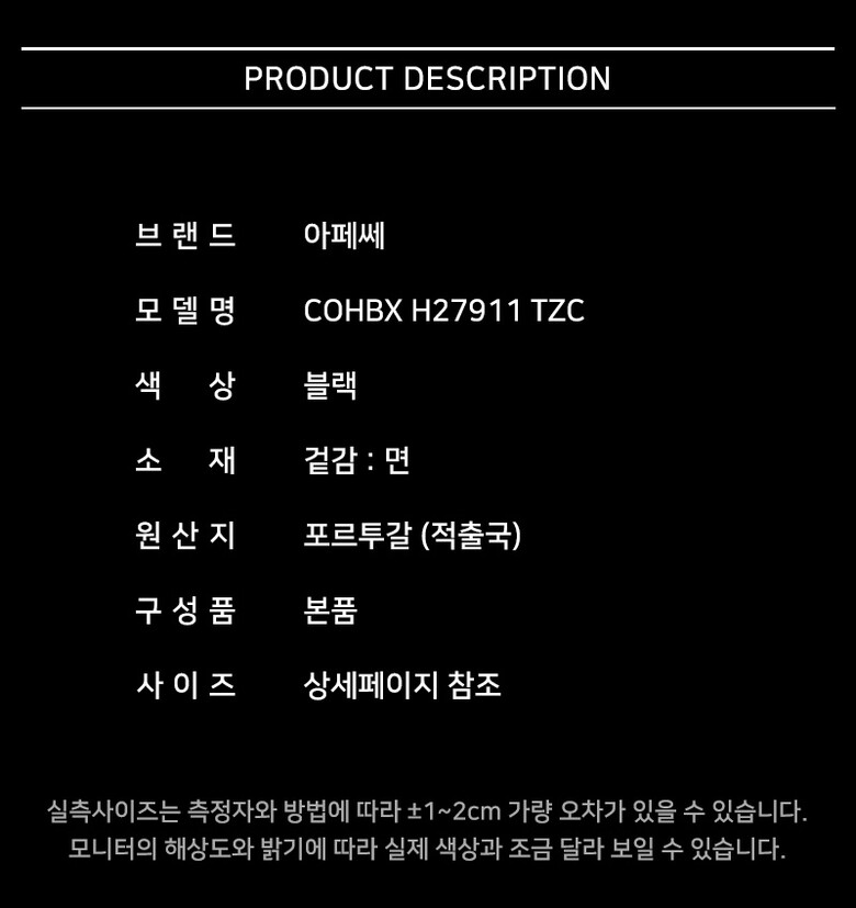 | 1. 제품 소재 (섬유의 조성 또는 혼용률을 백분율로 표시, 기능성인 경우 성적서 또는 허가서) | 상세페이지 참조 |