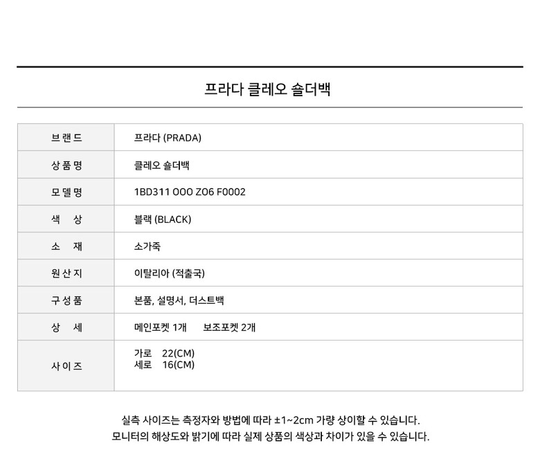 - #리본즈코리아 #1BD311OOOZO6F0002 #[명품] #프라다 #클레오 #플랩 #숄더백 #블랙 #1BD311 #OOO #ZO6 #F0002 #여성 #가방/핸드백 #숄더백/호보백