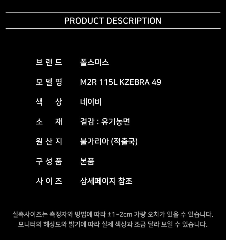 | 1. 제품 소재 (섬유의 조성 또는 혼용률을 백분율로 표시, 기능성인 경우 성적서 또는 허가서) | 상세페이지 참조 |