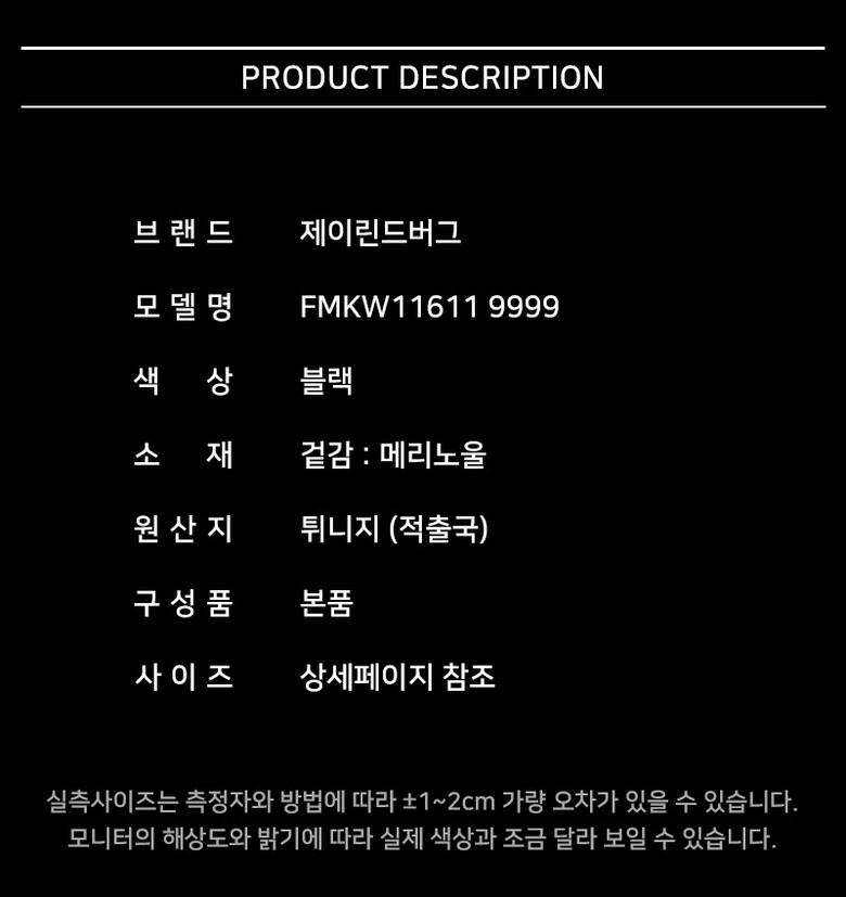 | 1. 제품 소재 (섬유의 조성 또는 혼용률을 백분율로 표시, 기능성인 경우 성적서 또는 허가서) | 상세페이지 참조 |