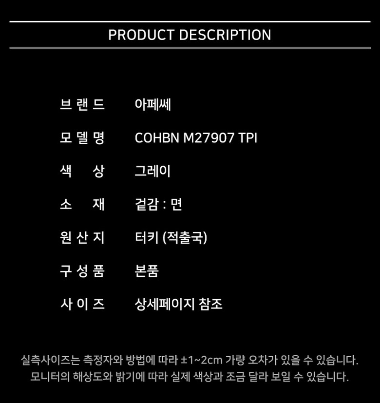 | 1. 제품 소재 (섬유의 조성 또는 혼용률을 백분율로 표시, 기능성인 경우 성적서 또는 허가서) | 상세페이지 참조 |