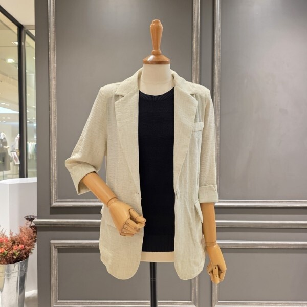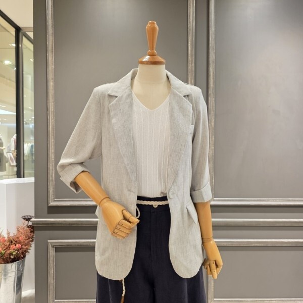 25년 S/S 신상품?슬림한 라인감이 돋보이는 8부소매자켓을 보여드려요~린넨 혼방 자켓으로 소매 롤업이 포인트인 캐주얼 자켓입니다