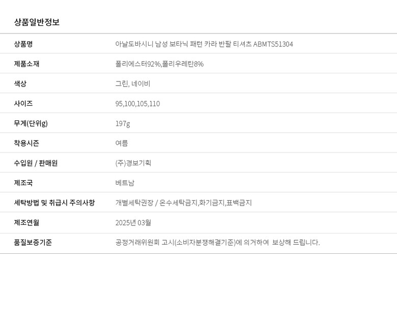 | 6. 세탁방법 및 취급시 주의사항 | 개별세탁권장/온수세탁금지,화기금지,표백금지 |