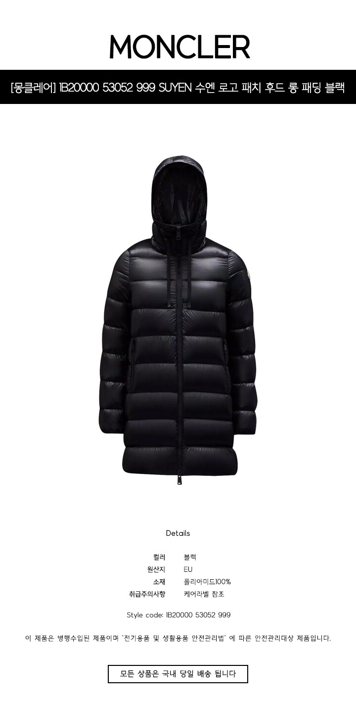 [명품] 1B20000 53052 999 SUYEN 수엔 로고 패치 후드 롱 패딩 블랙 여성 자켓 /