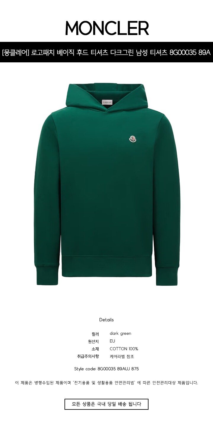 [명품] 로고패치 베이직 후드 티셔츠 다크그린 남성 티셔츠 8G00035 89AUJ 875 /