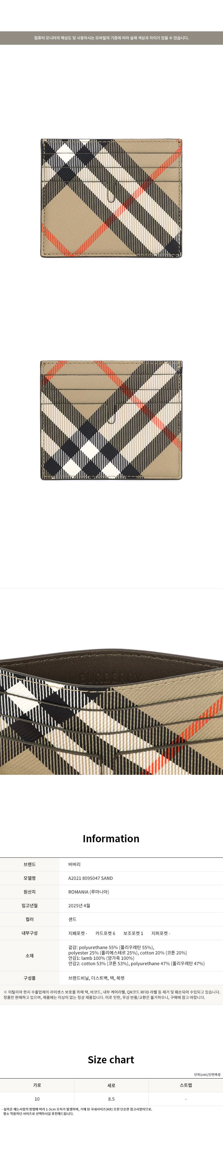 [명품] 25SS 버버리 샌드 톨 체크 카드지갑 8095047 SAND