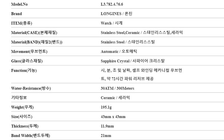 [명품] 론진 L3.782.4.76.6 하이드로콘퀘스트 세라믹 남성 메탈시계