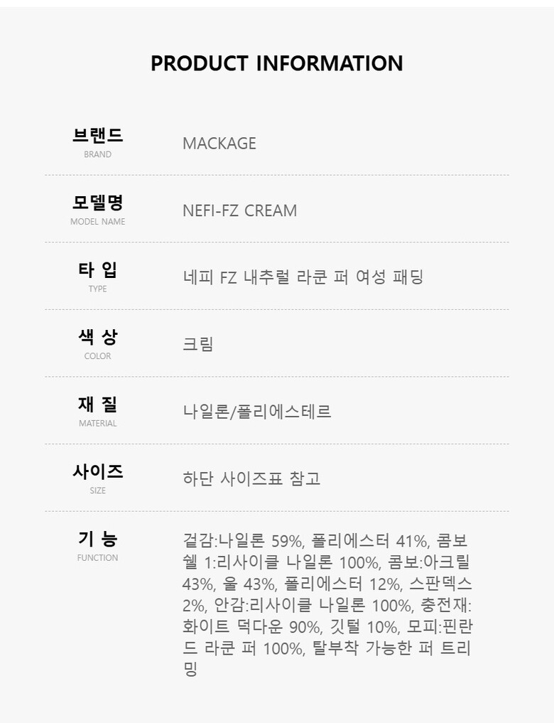 [명품] 맥케이지 NEFI FZ CREAM 네피 FZ 내추럴 라쿤 퍼 여성 패딩