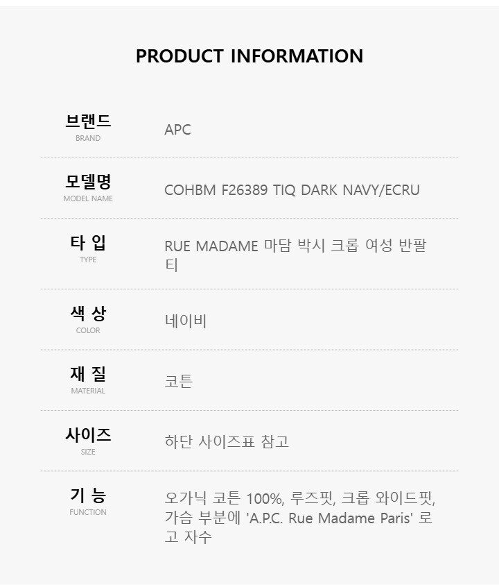 - #리본즈코리아 #COHBMF26389TIQDARKNAVY/ECRU #[명품] #아페쎄 #COHBM #F26389 #TIQ #DARK #NAVY/ECRU #RUE #MADAME #마담 #박시 #크롭 #여성 #반팔티 #의류 #상의 #티셔츠