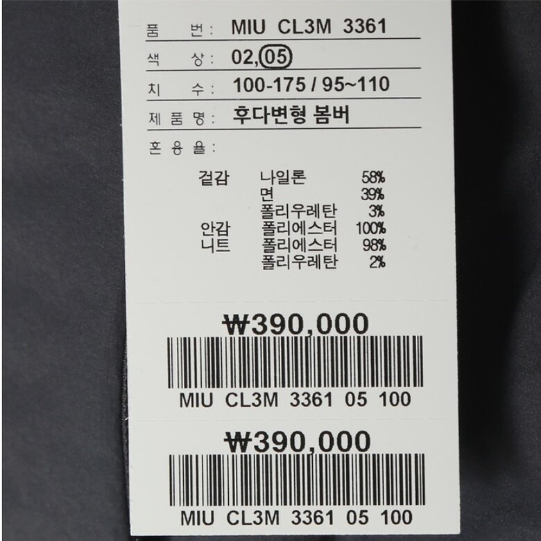 겉감 : 나일론 58%|*| 면 39%|*| 폴리우레탄 3% 니트 : 폴리에스터 98%|*| 폴리우레탄 2%