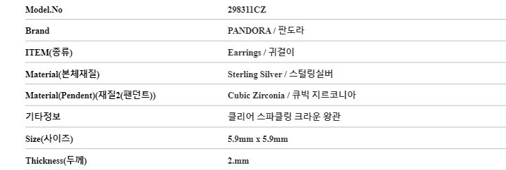 [명품] 판도라 298311CZ 모먼트 클리어 스파클링 크라운 실버 귀걸이