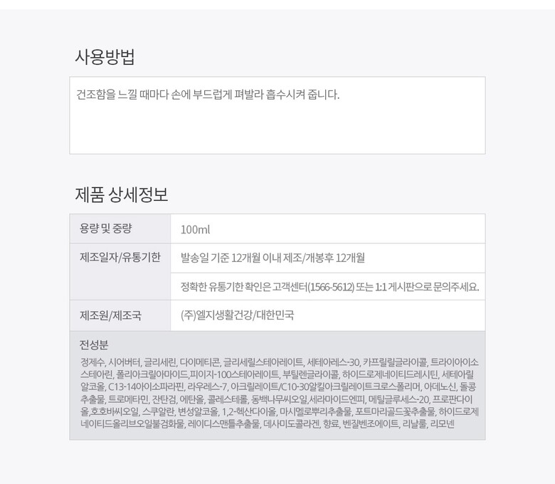 9. 사용 시 주의사항 | 1. 화장품을 사용 중 붉은 반점, 부어오름, 가려움증, 자극 등의 이상이 있는 경우, 적용 부위가 직사광선에 의하여 이상이 생긴 경우 사용을 중지하시고 피부과 전문의와 상담하세요. 2. 상처가 있는 부위, 습진 및 피부염 등의 이상이 있는 부위에는 사용하지 마세요. 117. 보관 및 취급시 주의사항 가)사용 후에는 반드시 마개를 닫아두세요. 나)유아ㆍ소아의 손이 닿지 않는 곳에 보관하세요. 다)고온 다습한 곳 및 직사광선 닿는 장소는 피해주세요. |